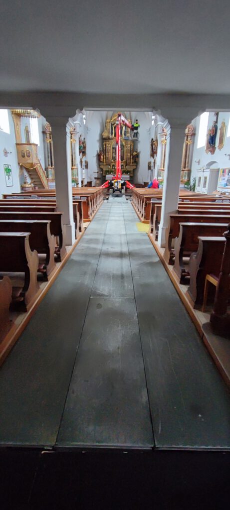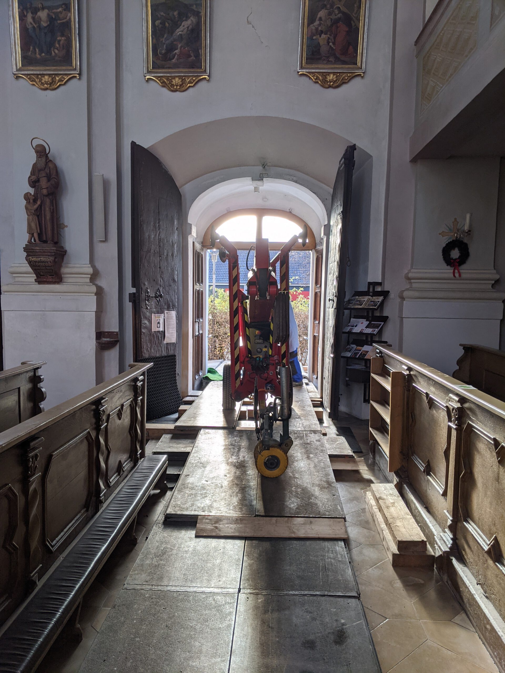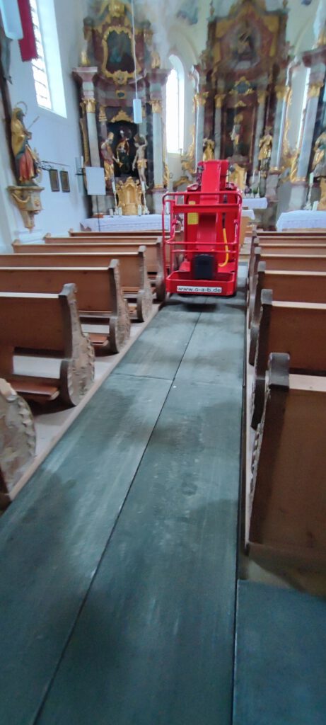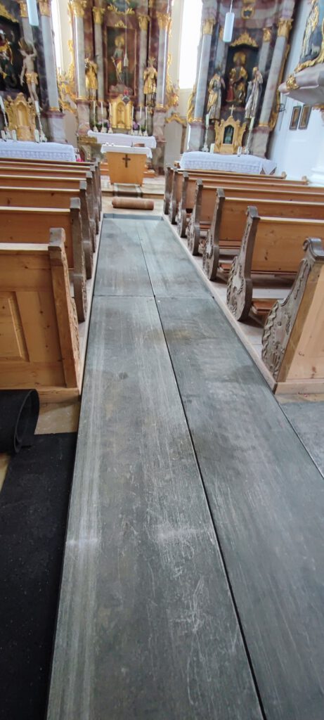 3,68m lang 0,66m breit Können auf allen vier Seiten ineinander verhakt werden,dadurch können sie nicht mehr verutschen Der Boden wurde vorher mi 1,5 cm dicken Gummimatten ausgelegt um die Fliesen zu schützen Hier wurden die Stufen im Eingangsbereich der Kirche mit den Aluminiumplatten komplett überbaut um die Fliesen zu schützen Durch die Steifigkeit der Aluminiumplatten werden Punktbelastungen von Reifen auf große Flächen verteilt, Kunstoffplatten können das nicht.