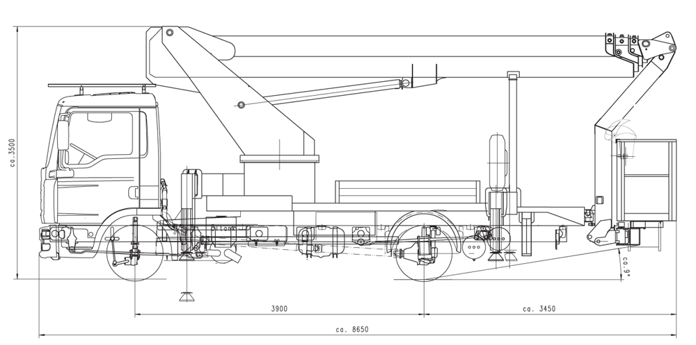 | Automatische Stützennivellierung | Stufenlose voll-variable Abstützung 2,46 bis 4,97 m |
